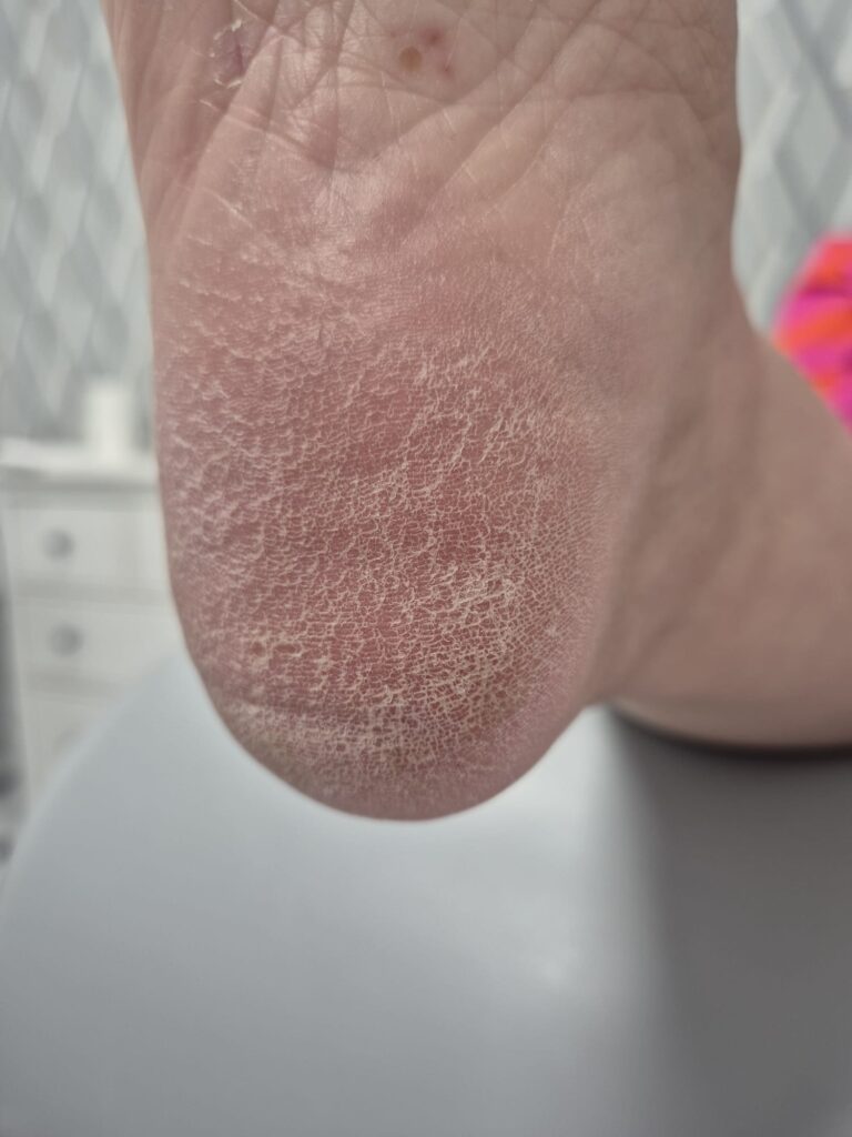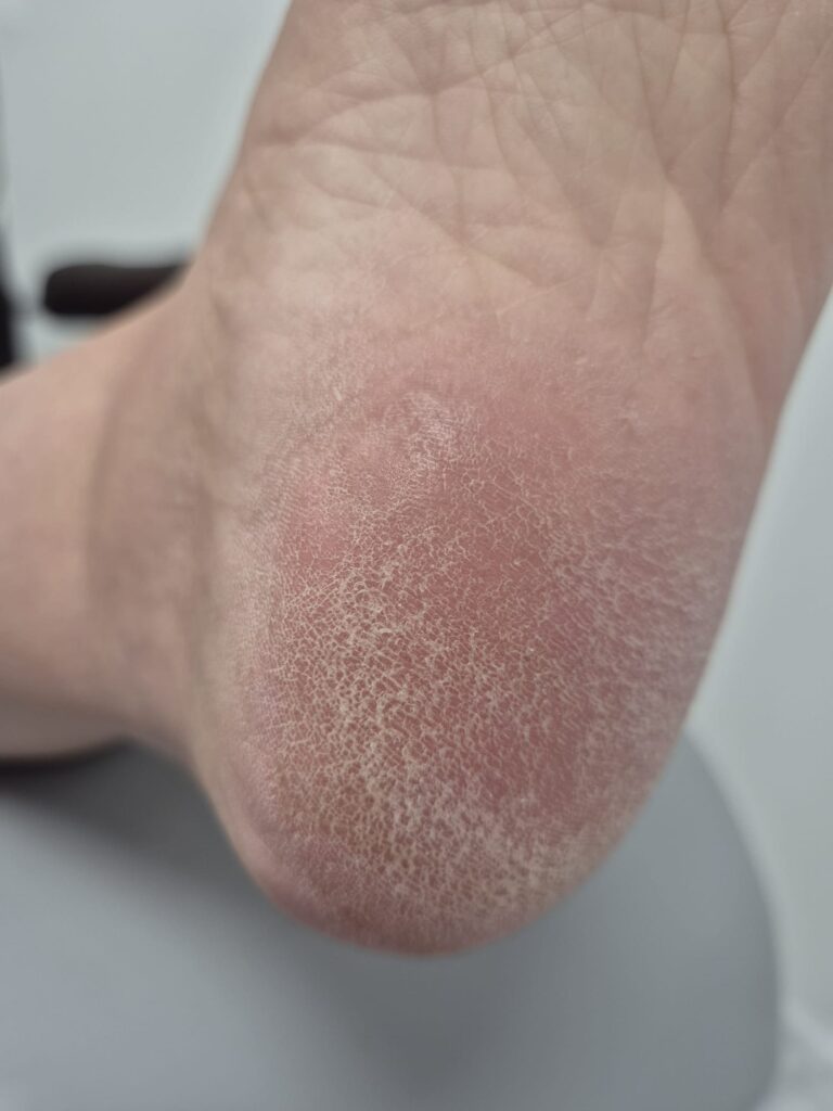 Widoczna hiperkeratoza i łuszczenie nie były jedynie defektem estetycznym – to jasny sygnał, że bariera hydrolipidowa została całkowicie zdestabilizowana, a skóra znajduje się w stanie silnego odwodnienia.