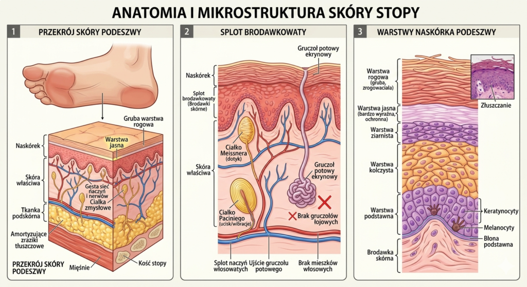 Badania histologiczne wykazują, że naskórek podeszwowy liczy od 30 do 60 warstw komórkowych – podczas gdy skóra grzbietowa stopy ma ich zaledwie 8-12. Warstwa rogowa (stratum corneum) jest tu 16-krotnie grubsza niż w innych lokalizacjach ciała. Na podeszwie występuje również stratum lucidum – warstwa przezroczysta, obecna wyłącznie w skórze grubej, której zadaniem jest koncentracja keratyny przed finalnym rogowaceniem komórek.